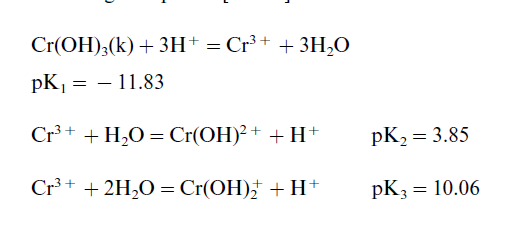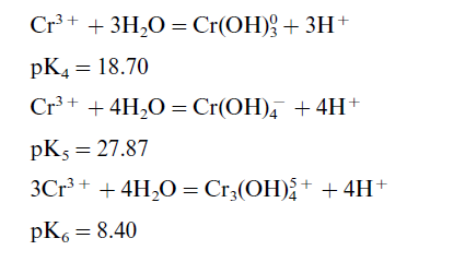 如下图所示的这种不同pH下Cr3+形态分布图怎么画?还有谁能告诉我具体的电离方程式和电离平衡常数,文献中查的比较乱 还有求解图片中第一个公式后面的Cr(OH)3(K)是什么思意?谢谢! [ Last edited by sddtc888 on 2014-1-17 at 15:15 ] |