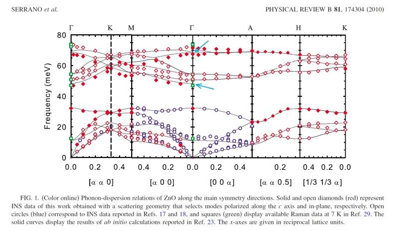 请教大家一个问题,贴图是一篇文献(PRB,81,174304)中的一个图,用ABINIT算的Wurtzite结构ZnO的声子谱同实验数据的比较。图中声子谱在Gamma点出现了不连续(我用蓝色箭头标注了下),请教下这些不连续是何原因?非常感谢!! |