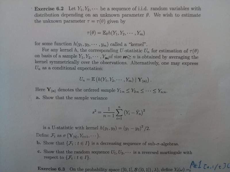a 小问倒是会做,但是b,c两问就不会了。对于c小问,我以前只知道如果Ft 选择得好的话,U-statistic 是reverse martingale。但是不知道这个题里这么定义的Ft该怎么证他是reversed martingale.求助b,c两问. IMG_20140124_105734.jpg |