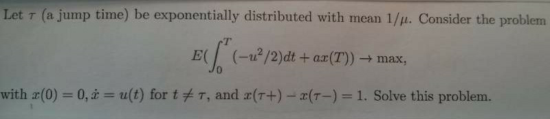 请大牛们帮忙看一下:用Pontryagin's maximum principle 我能写出before the jump 的式子x(t)=....., 但是after the jump的时候呢? 以及不知道接下来怎么做. 2345看图王_看图王.png [ Last edited by feixiaolin on 2014-1-26 at 07:49 ] |