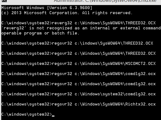 需要安装控件,32位、64位,win8和win7都可以解决 (1)Threed32.ocx 下载并拷贝Threed32.ocx文件到系统目录里:1、Windows XP/WIN7/Vista系统,将Threed32.ocx复制到C:\Windows\System32目录下。2、如果您的系统是64位的请将文件复制到C:\Windows\SysWOW64目录 打开"开始-运行-输入regsvr32 Threed32.ocx",回车即可解决。 如果需要管理员权限: C:\WINNT\System32目录下,找到CMD.exe,右键选择‘以管理员身份运行’,在弹出的框中输入regsvr32 Threed32.ocx,回车。 (2)Mscomct2.ocx 下载并拷贝mscomct2.ocx文件到系统目录里:Windows XP/WIN7/Vista系统,将mscomct2.ocx复制到C:\Windows\System32目录下。 打开"开始-运行-输入regsvr32 mscomct2.ocx ",回车即可解决。 如果需要管理员权限: C:\WINNT\System32目录下,找到CMD,右键选择‘以管理员身份运行’,在弹出的框中输入regsvr32 mscomct2.ocx ,回车。 |