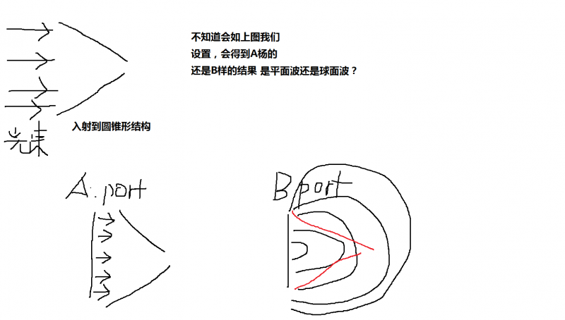 球面波要点光源来产生 想象一个点光源在port的中间,并定为坐标原点,那么在port上各处的场就可以写成 E=A/|y|*exp(i*k*y); A是常数,y是离开光源的坐标。 振幅分布为A/|y| 相位分布为k*y A取成1,那么你可以在全局定义建立两个参数 lam=632.8[nm] (假如用632.8nm的波长) k=2*pi/lam 建立一个解析函数: e=1/abs(y)*exp(i*k*abs(y)) 假如是z偏振的光,在port的场分布Ex Ey Ez后写入: Ex:0 Ey 0 Ez e 传播常数填 emw.k0 不过用port做的这种效果不是很好,场变形有点严重。 换“电场”光源做会好一些。 建议用电偶极子 |