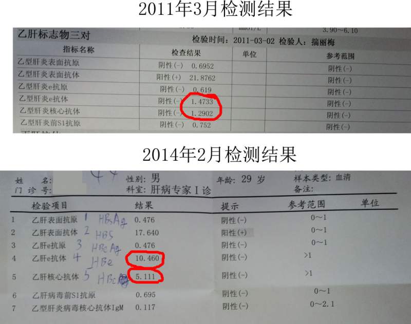 我8年曾注射过一支乙肝疫苗,之后一直没注射。11年检查过乙肝两对半,与今天检测结果对比,有下述几点不清楚,请大家帮忙分析分析: 1、乙肝e抗体和乙肝核心抗体数值有较大增幅,说明什么? 2、这次乙肝表面抗体数值17.6,能挺多长时间不注射乙肝疫苗?之后多长时间再去检测合适? 未标题-1.jpg |