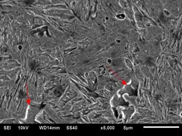 下面是我的拍的电镜,材料是含碳量为0.2%的硼钢,经过900℃,5min热处理后,转移至冷模具中淬火。腐蚀方法是4%硝酸酒精。