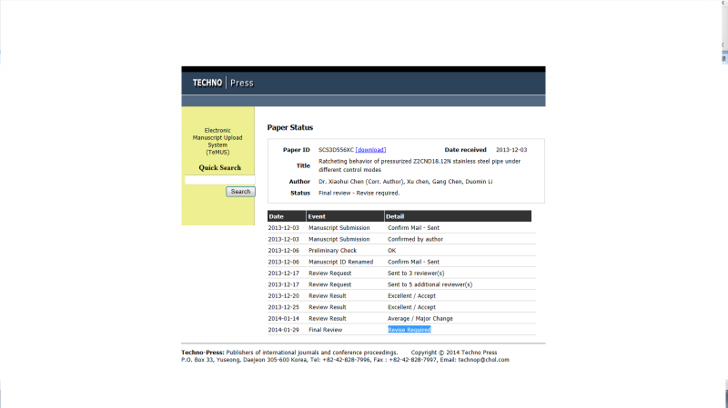 我在杂志‘STEEL AND COMPOSITE STRUCTURES’上投稿,现在状态是‘ Revise Required ’,但是没有收到修改意见,在网站上也没有找到? paper status.png |