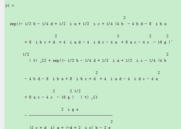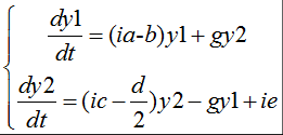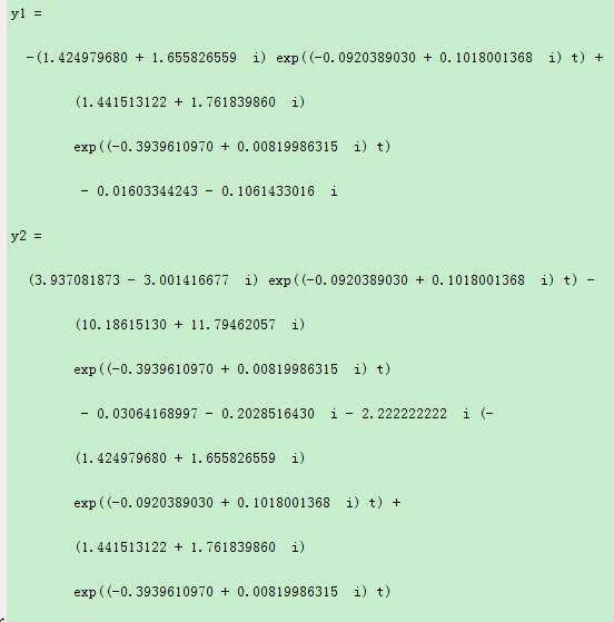 如图,a=0.1,b=0.086,g=0.045,c=0.01,d=0.8,e=-0.069+0.109*i(复数) 当t=0时,y1=0.0005-0.00013*i,y2=-6.28-15*i 要求用matlab求此微分方程组的解,形式为exp()+exp()+复数 给我一个可运行的完整命令,谢谢了!!! 图片1.png |
