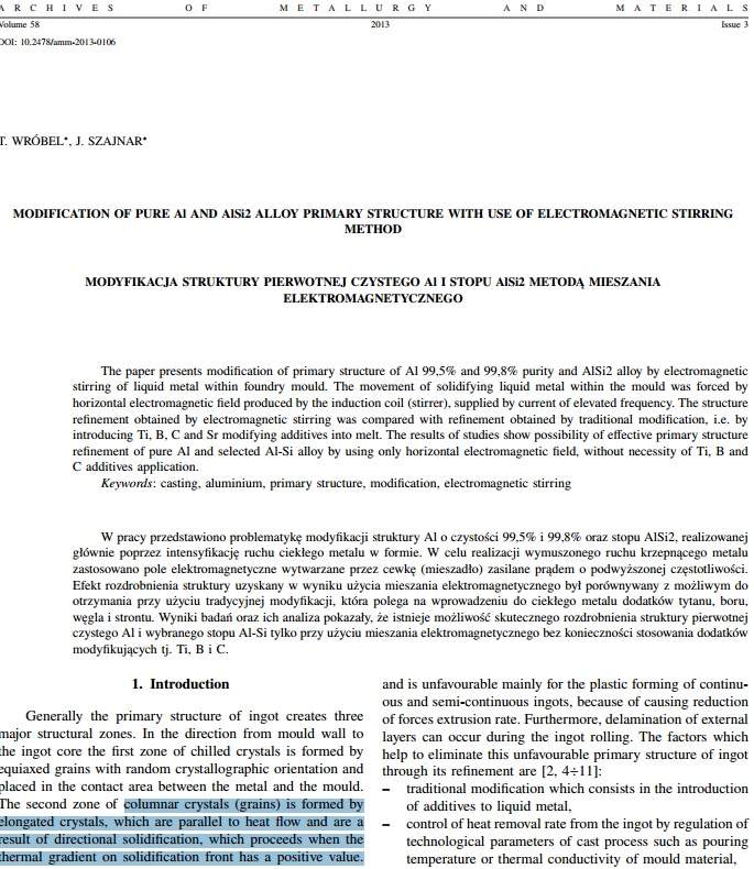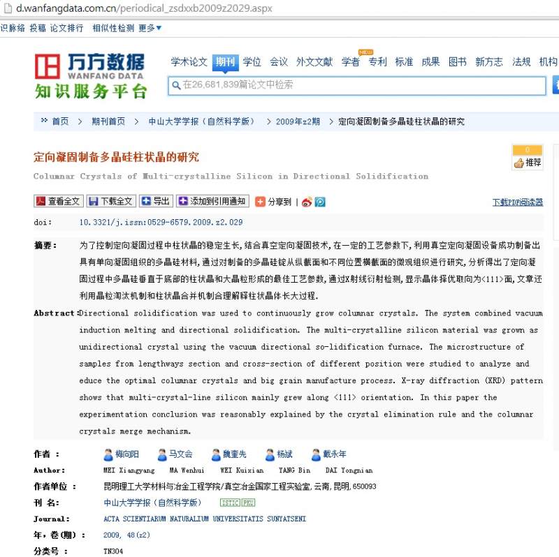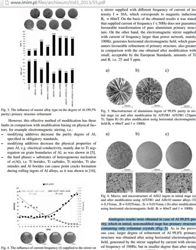 柱状晶具有优良的抗蠕变和抗疲劳能力、卓越的电学和信号传输性能,同时具有抑制裂纹扩展等优点,因此研究柱状晶生长过程及其影响因素具有非常重要的科学意义和实际应用价值 (根据原文) Columnar crystals increase creep, fatigue, and thermal crack resistance, as well as electrical conductivity and signal transmission. To the extent cutting tools already benefit from being coated with vapor-deposited TiCN [1], future research into columnar crystal cultivation holds even greater promise for electronics [2,3] and other industries. For example, a patent [4] already exists for making columnar crystal scintillators by vapor deposition. (论文摘要) A novel cultivation method is presented for growing columnar crystals whose promise of higher creep, fatigue, and thermal crack resistance have already by realized by cutting tool manufacturers [1]. Methods more efficient than vacuum induction [5] are applied to promote directional solidification processes [6] responsible for columnar crystal formation. 注意: 记得改用标准引用标注 [1] Tangaloy 2007 Catalog http://www.tungaloy.co.jp/common ... g/e/01_grades_e.pdf [2] "the PCB Magazine" http://www.magazines007.com/emag ... nd/PCB-June2013.pdf [3] Shengbei PCB website http://www.shenbeipcb.com/en/ind ... tid=3&id=87 [4] US20130186943A1 Patent [5] MODIFICATION OF PURE Al AND AlSi2 ALLOY PRIMARY STRUCTURE WITH USE OF ELECTROMAGNETIC STIRRING METHOD http://www.imim.pl/files/archiwum/Vol3_2013/55.pdf [6] 定向凝固制备多晶硅柱状晶的研究 http://d.wanfangdata.com.cn/periodical_zsdxxb2009z2029.aspx ------------------------------------------ 重要:记得查你的木虫论坛信箱 !! ------------------------------------------ Tungaloy2007.jpg PCB Copper.jpg Shenbei PCB.jpg US20130186943A1.jpg ELECTROMAGNETIC STIRRING p1.jpg ELECTROMAGNETIC STIRRING p3.jpg 定向凝固制备多晶硅柱状晶的研究.jpg |