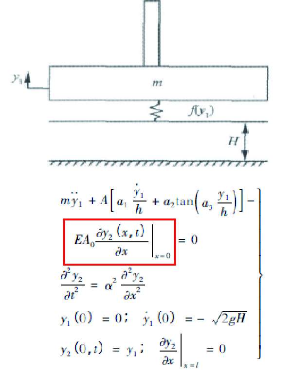 系统中其他参数如下:m=3kg,易损件密度p=500kg/m3,弹性模量E=10^7Pa,易损件长度L=0.03,杆的横截面积A0=5*10^-6m2,a1=280,a2=8.94*10^4,a3=1.91,A=0.01m2,厚度h=0.035m,跌落高度H=0.5m,上述参数在y1的求解中我基本都带到方程中化简了,求解y1时不考虑红色方框中部分。二阶双曲偏微分方程中的alpha^2=E/P(弹性模量/密度)。