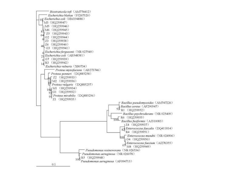 我看你的图有些别扭,但是从位置上看和艾希氏菌属比较近,如果有伯杰氏手册在,可以在里面找到属级以上的系统进化树,便于你选取比对的序列。如果没有,试着多调取一些同科的序列,或者同目下其他科的几个序列即可。方法就是用clust_x比对后,掐头去尾(也就是你说的截成一样长度),再用mega构建分子系统进化树