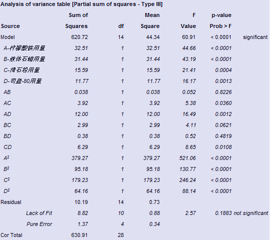 Sum of Mean F p-value Source Squares df Square Value Prob > F Model 620.72 14 44.34 60.91 < 0.0001 significant A-柠檬酸铁用量 32.51 1 32.51 44.66 < 0.0001 B-液体石蜡用量 31.44 1 31.44 43.19 < 0.0001 C-滑石粉用量 15.59 1 15.59 21.41 0.0004 D-司盘-80用量 11.77 1 11.77 16.17 0.0013 AB 0.038 1 0.038 0.052 0.8226 AC 3.92 1 3.92 5.38 0.0360 AD 12.00 1 12.00 16.49 0.0012 BC 2.99 1 2.99 4.11 0.0621 BD 0.38 1 0.38 0.52 0.4819 CD 6.29 1 6.29 8.65 0.0108 A^2 379.27 1 379.27 521.06 < 0.0001 B^2 95.18 1 95.18 130.77 < 0.0001 C^2 179.23 1 179.23 246.24 < 0.0001 D^2 64.16 1 64.16 88.14 < 0.0001 Residual 10.19 14 0.73 Lack of Fit 8.82 10 0.88 2.57 0.1883 not significant Pure Error 1.37 4 0.34 Cor Total 630.91 28 Std. Dev. 0.85 R-Squared 0.9838 Mean 85.38 Adj R-Squared 0.9677 C.V. % 1.00 Pred R-Squared 0.9161 PRESS 52.93 Adeq Precision 27.182 [ Last edited by 宠医LollyJJ on 2014-2-22 at 19:06 ] |