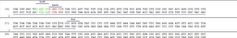 ... 请参照这张图谱 http://wenku.baidu.com/view/230f8af7ba0d4a7302763ae4.html 翻译是从NcoI的ATG开始,所以到BamHI时刚好是GGA翻译为Gly TCC翻译为Ser,所以诚如上边同学所答,不用加碱基,不是看NTI自己弄成的三个三个方式,而是要从ATG开始数的。 祝实验顺利 ![]() |