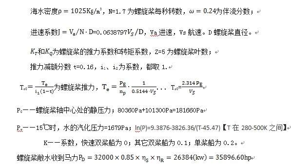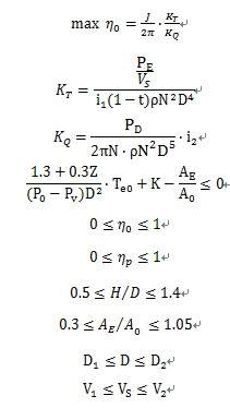 还是有参数未用到,或不明确。 下面是 1stop代码,你自己再行整改 ------------------------------------------------------- Parameters D[0.3, 2.4], vs[0, 60] , aea[0.3, 1.05] , np[0, 1]; Constant K=0; // 0.1, 0.2 Constant r=1025; Constant N=1.7; Constant i1=1, i2=1; Constant pd=35896.6, p0= 181660; ConstStr Te=pe/np/0.5144/vs, Tc=2.314*pe/vs; ConstStr kt=pe/vs/(i1*(1-t)*r*N^2*D^4); ConstStr kq=pd*i2/(2*pi*N* r*N^2*D^5); ConstStr J=0.0638797*vs/D; ConstStr f0=J/2/pi/kq*kt; MinFunction f0; 0<=f0; (1.3+0.3*z)/(p0-pd)/D^2*Te+K-aea<=0; // aea = ae/a0 0<=fp<=1; 0.5<= H/D<=1.4; |