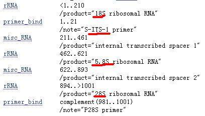 用了一对通用引物(18S,26S)扩增了某一虫子的rDNA-ITS,测序已获得1000bp左右片段。 求教:如何定义所测得的DNA序列中18S、ITS1、5.8S、TIS2和28S在所获得的序列的位置?如NCBI中相关截图所示 谢谢! 0.JPG |