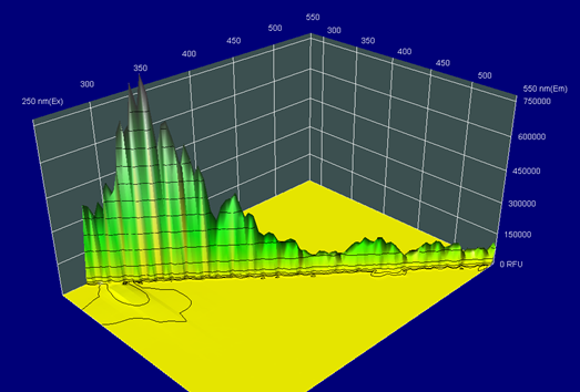 我做了一个扫描图,激发波长250-550,发射光谱280-550,请问这个谱图有意义吗? 样品中是否含有荧光类物质?