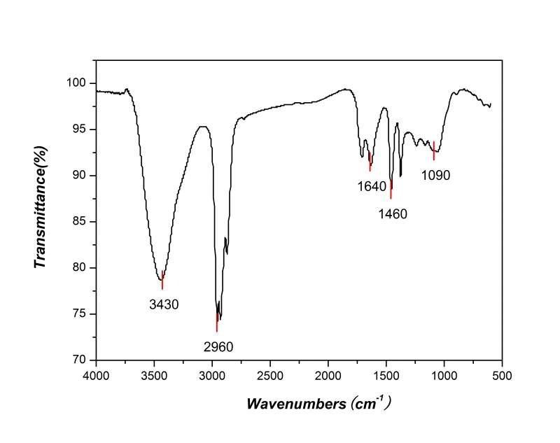 EDS表明有C和O两种元素,3430、1460cm-1处的吸收峰证明分子中含有醇羟基,1640cm-1有吸收峰,但其强度低,可不可认为表面该物质结构中并不存在羰基,而是该样品中存在少量的羰基化合物,以杂质的形式存在?1090cm-1是不是C-O伸缩振动峰呢?我是新手,拜托各位了