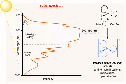 Interest in photochemical synthesis has been motivated in part by the realization that sunlight is effectively an inexhaustible energy source.Chemists have also long recognized distinctive patterns of reactivity that are uniquely accessible via photochemical activation. However, most simple organic molecules absorb only ultraviolet (UV) light and cannot be activated by the visible wavelengths that comprise most of the solar energy that reaches Earth’s surface. Consequently, organic photochemistry has generally required the use of UV light sources.