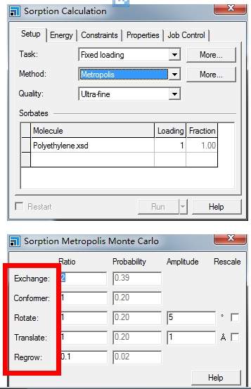 Metropolis法概率的设置 MS 中的界面如图1,概率包括exchange、conformer、rotate、translate、regrow 而文献给出的设置如图2所示,包括 translate、rotate、delete、create 这两者如何对应起来呢 请大家指教 谢谢! |