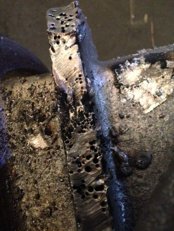 304不锈钢铸造产生气孔,而且多集中在上箱,而且切开后越往里越大,如图