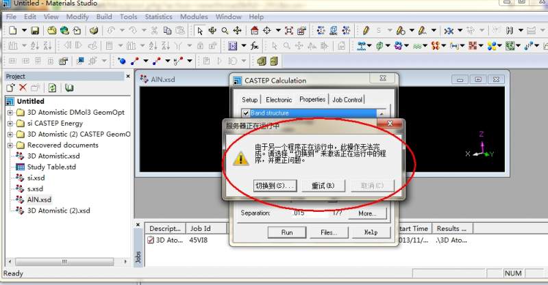 在Material Studio中计算energy的时候出现了图中所示的问题,有人出现过相同的问题的吗?或是知道怎么解决的,帮忙解决一下,谢谢
