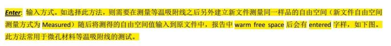 Enter: 输入方式。 如选择此方法, 则需要在测量等温吸附线之后另外建立新文件测量同一样品的自由空间 (新文件自由空间 测量方式为 Measured)随后将测得的自由空间值输入到原文件中,报告中 warm free space 后会有 entered 字样,如下图。 此方法常用于微孔材料等温吸附线的测试。 |