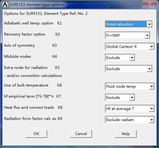 这个选项是在你的对流换热系数随温度变化时 (在材料属性中定义随温度变化的对流换热系数),确定按照哪一种温度来插值得到当前温度的对流换热系数,设置不同的 keyopt(8) 的值,可以以不同方式分别处理热流和对流载荷: 0 - 忽略热流和对流载荷; 1 - 包括热流载荷,忽略对流载荷 2~5:共同的是忽略热流载荷,只考虑对流载荷;不同的分别是: 2 换热系数按照 (Ts+Tb)/2 计算 3 换热系数按照 Ts 计算 4 换热系数按照 Tb 计算 5 换热系数按照 |Ts-Tb| 计算 其中: Ts- 固体表面温度; Tb - 流体温度 对你的情况,在 SF 命令中直接给出了常数的对流换热系数,不需要任何插值。因此,设置 keyopt(8) 为2~5,其效果是一样的,即都是只考虑对流载荷,而对流换热系数都是 100。 注意:只有材料属性中给出了随温度变化的对流换热系数,且 SF 命令中,应该是对流换热系数的位置填写的是负值,软件才会根据 keyopt(8) 的设置来计算对流换热系数。 |
