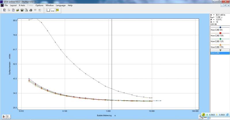 我在使用最大气泡压力法表面张力仪测量高浓度样品(10%-30%甚至更高)样品的时候,得出如下图的曲线,发现几次测量出来的曲线变化比较大,无法看出明显的趋势和结果。 应该用什么方法改进测试? |