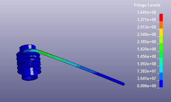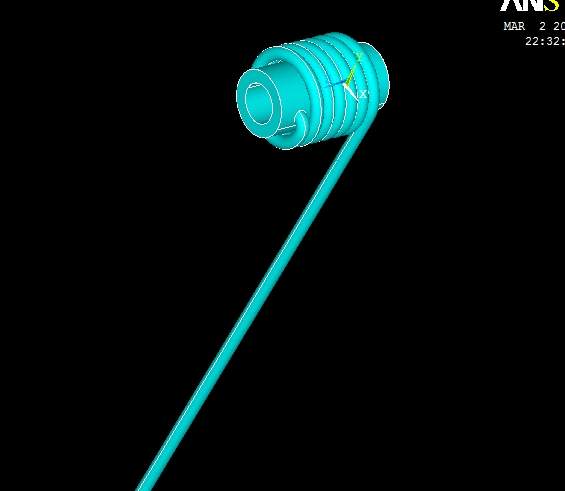 我在这里给你发吧,我是建立这样一个模型,中间空心圆柱我设置为刚体,弹簧结构的体设置为弹性体,都是选用的solid164号单元,刚体和弹性体之间采用固连接触连接在一起的,在刚体上施加位移约束和旋转角速度的载荷,刚体带动弹性体转动,可以运动,但是弹簧结构的部件上会受到很大的应力,如图,可以达到几百MPa了