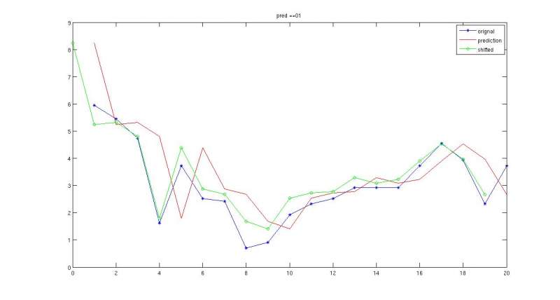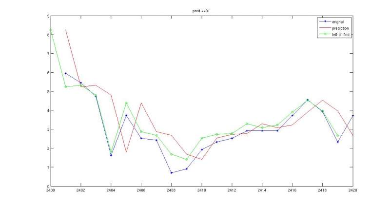 但是现在得到的结果总是没有体现出预测来,如附图所示,蓝线是原始值,红线是这样的网络预测值,绿线是将这个预测值的线向左移动一下得到的。