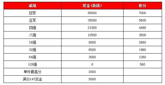 斯诺克海口赛奖金积分 冠军8.5万镑+7000积分