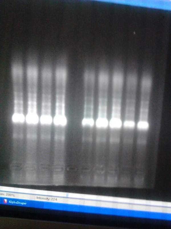这是跑的那个RNA的甲醛变性胶。在那个很亮的条带上面的那些不清楚的条带会是什么?什么原因造成的?