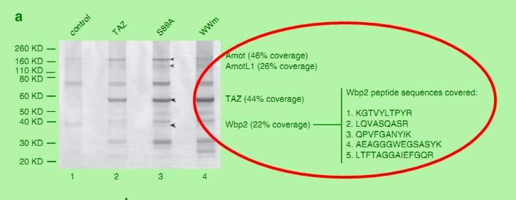 AmotL1, TAZ, Wbp2 and their MS coverage of the polypeptide were indicated (left). The Wbp2 peptide sequencescovered are shown