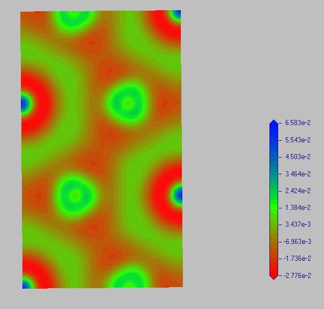 请参考一下步骤: 1. 做一次单点能计算,确认你把property里electron density difference包括进去了; 2. 打开View --> Toolbars --> Volume visualization (有这个后,create slice选项在界面能看到) 3. 打开结构文件,点击分析castep --> analysis, 然后把电子密度或者电子密度差导入,这时候整个结构会有电子密度的等高线图 4. 切片分析:点击create slice,随便做一个和某个轴平行的切面,然后点击这个切面然后在左侧可以修改这个切面的位置到任何你期望的; 5. 把电荷密度等高线和原子坐标都选不显示,你就得到了上面的图。 |