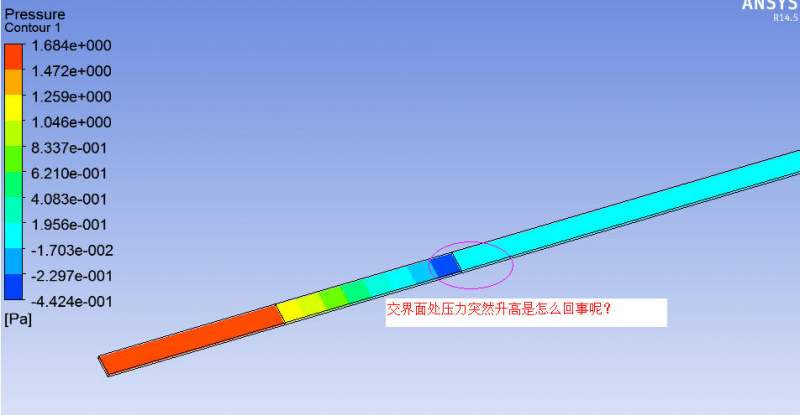 有一个计算模型,三维矩形通道,中间是多孔介质区域,前后都是流体区域,多孔介质的上下左右设置的都是壁面。在多孔介质区域和出口段的交界面处,会出现压力突然升高,理论上来讲,压力时逐渐降低才对,突然升高是为什么呢?但是进口段与多孔介质区域的交界面没有出现这种情形。 问题急需解决,谢谢各位啊~ Snap5.jpg |