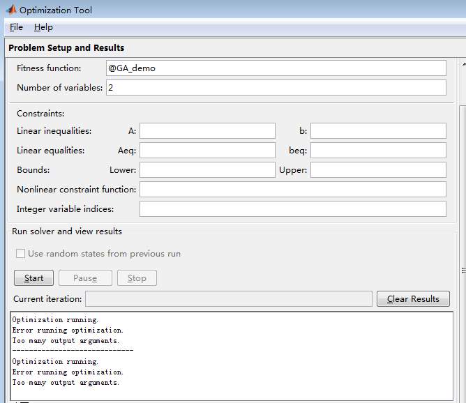 我采用Matlab自带的优化工具箱GUI编程,按照书上的例题输入参数,可是结果却出现错误,求教哪里出现了问题?谢谢,如图