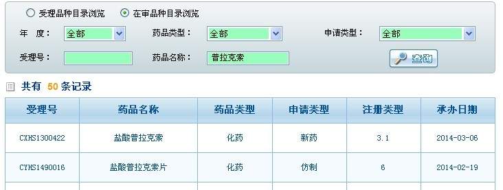以下是申报信息,希望对你有用哈! 盐酸普拉克索 CXHS1300422浙 化药 新药 3.1 2014-03-06 杭州华东医药集团康润制药有限公司 在审评 查看 盐酸普拉克索片 CYHS1490016 化药 仿制 6 2014-02-19 南京先声东元制药有限公司 在审评 查看 盐酸普拉克索片 CYHS1490017 化药 仿制 6 2014-02-19 南京先声东元制药有限公司 在审评 查看 盐酸普拉克索 CXHS1400038苏 化药 新药 3.1 2014-02-19 南京先声东元制药有限公司 在审评 查看 盐酸普拉克索 CXHS1300282鲁 化药 新药 3.1 2014-01-26 齐鲁制药有限公司 在审评 查看 盐酸普拉克索 CXHS1300319冀 化药 新药 3.1 2014-01-15 石药集团欧意药业有限公司 在审评 查看 盐酸普拉克索 JXHL1300494国 化药 进口 2014-01-09 奥贝泰克药物化学(天津)有限公司 在审评 查看 盐酸普拉克索片 CYHS1300725川 化药 仿制 6 2013-12-27 四川科伦药业股份有限公司 在审评 查看 盐酸普拉克索片 CYHS1300730川 化药 仿制 6 2013-12-27 四川科伦药业股份有限公司 在审评 查看 盐酸普拉克索片 CYHS1300727川 化药 仿制 6 2013-12-27 四川科伦药业股份有限公司 在审评 查看 盐酸普拉克索片 JXHL1300471国 化药 进口 2013-12-23 山东绿叶制药有限公司 在审评 查看 盐酸普拉克索片 JXHL1300473国 化药 进口 2013-12-13 山东绿叶制药有限公司 在审评 查看 盐酸普拉克索片 JXHL1300472国 化药 进口 2013-12-13 山东绿叶制药有限公司 在审评 查看 盐酸普拉克索 CXHL1300952湘 化药 新药 3.1 2013-10-30 湖南明瑞制药有限公司 在审评 查看 盐酸普拉克索 CXHS1300132闽 化药 新药 3.1 2013-10-25 福建科瑞药业有限公司 在审评 查看 盐酸普拉克索片 CYHS1300711闽 化药 仿制 6 2013-10-25 福建科瑞药业有限公司 在审评 查看 盐酸普拉克索片 CYHS1300712闽 化药 仿制 6 2013-10-25 福建科瑞药业有限公司 在审评 查看 盐酸普拉克索 CXHS1200374鄂 化药 新药 3.1 2013-08-09 宜昌天仁药业有限责任公司 在审评 查看 盐酸普拉克索片 CYHS1201182鄂 化药 仿制 6 2013-08-09 武汉人福药业有限责任公司 在审评 查看 盐酸普拉克索片 CYHS1201183鄂 化药 仿制 6 2013-08-09 武汉人福药业有限责任公司 在审评 查看 盐酸普拉克索 CXHS1300136川 化药 新药 3.1 2013-07-12 四川科伦药业股份有限公司 在审评 查看 盐酸普拉克索片 CYHS1201095津 化药 仿制 6 2013-05-21 天津红日药业股份有限公司 在审评 查看 盐酸普拉克索片 CYHS1201096津 化药 仿制 6 2013-05-21 天津红日药业股份有限公司 在审评 查看 盐酸普拉克索片 JXHL1300087国 化药 进口 2013-03-25 杭州欧华医药化工有限公司 在审评 查看 盐酸普拉克索片 JXHL1300089国 化药 进口 2013-03-21 杭州欧华医药化工有限公司 在审评 查看 盐酸普拉克索片 JXHL1300088国 化药 进口 2013-03-21 杭州欧华医药化工有限公司 在审评 查看 盐酸普拉克索 CXHS1200230津 化药 新药 3.1 2013-01-04 天津红日药业股份有限公司 在审评 查看 盐酸普拉克索 CXHL1200654苏 化药 新药 3.1 2012-12-26 江苏恒瑞医药股份有限公司 在审评 查看 盐酸普拉克索缓释片 CXHL1200658苏 化药 新药 5 2012-12-26 江苏恒瑞医药股份有限公司 在审评 查看 盐酸普拉克索缓释片 CXHL1200657苏 化药 新药 5 2012-12-26 江苏恒瑞医药股份有限公司 在审评 查看 盐酸普拉克索缓释片 CXHL1200656苏 化药 新药 5 2012-12-26 江苏恒瑞医药股份有限公司 在审评 查看 盐酸普拉克索缓释片 CXHL1200660苏 化药 新药 5 2012-12-26 江苏恒瑞医药股份有限公司 在审评 查看 盐酸普拉克索缓释片 CXHL1200655苏 化药 新药 5 2012-12-26 江苏恒瑞医药股份有限公司 在审评 查看 盐酸普拉克索 CXHS1200131浙 化药 新药 3.1 2012-11-30 上虞京新药业有限公司 在审评 查看 盐酸普拉克索片 CYHS1200705浙 化药 仿制 6 2012-11-30 浙江京新药业股份有限公司 在审评 查看 盐酸普拉克索片 CYHS1200704浙 化药 仿制 6 2012-11-30 浙江京新药业股份有限公司 在审评 查看 盐酸普拉克索片 CYHS1101803苏 化药 仿制 6 2012-06-19 南京先声东元制药有限公司 制证完毕-已发批件江苏省 ************* 查看 盐酸普拉克索片 CYHS1101804苏 化药 仿制 6 2012-06-19 南京先声东元制药有限公司 制证完毕-已发批件江苏省 ************* 查看 盐酸普拉克索缓释片 JXHS1200028国 化药 进口 2012-04-18 无 在审评 查看 盐酸普拉克索缓释片 JXHS1200025国 化药 进口 2012-04-18 无 在审评 查看 盐酸普拉克索缓释片 JXHS1200026国 化药 进口 2012-04-18 无 在审评 查看 盐酸普拉克索缓释片 JXHS1200029国 化药 进口 2012-04-18 无 在审评 查看 盐酸普拉克索缓释片 JXHS1200027国 化药 进口 2012-04-18 无 在审评 查看 盐酸普拉克索 CXHS1100277苏 化药 新药 3.1 2012-04-11 南京先声东元制药有限公司 制证完毕-已发批件江苏省 ************* 查看 盐酸普拉克索片 CYHS1001363苏 化药 仿制 6 2011-08-04 华裕(无锡)制药有限公司 在审评 查看 盐酸普拉克索片 CYHS1001362苏 化药 仿制 6 2011-08-04 华裕(无锡)制药有限公司 在审评 查看 盐酸普拉克索 CXHS1000320苏 化药 新药 3.1 2011-04-18 华裕(无锡)制药有限公司 在审评 查看 盐酸普拉克索片 JXHL1000340国 化药 进口 2010-11-23 上海诺华贸易有限公司 在审评 查看 盐酸普拉克索片 JXHL1000341国 化药 进口 2010-11-17 上海诺华贸易有限公司 在审评 查看 盐酸普拉克索片 JXHL1000342国 化药 进口 2010-11-17 上海诺华贸易有限公司 在审评 查看 盐酸普拉克索片 JXHL1000163国 化药 进口 2010-05-27 杭州法默凯医药科技有限公司 在审评 查看 盐酸普拉克索片 JXHL1000162国 化药 