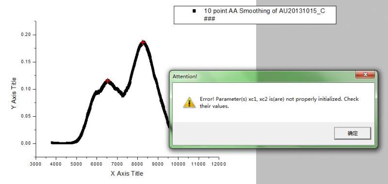 同一个数据,在实验室电脑和同学电脑上都尝试了高斯拟合分峰,均成功。但在自己的电脑上就出问题,origin6.0大家都是用一个安装包安装的,区别就是我的电脑是win7 64位,其他都是32位操作系统,会不会跟这个有关系。大神救我!!!! 详情见图 123.jpg |