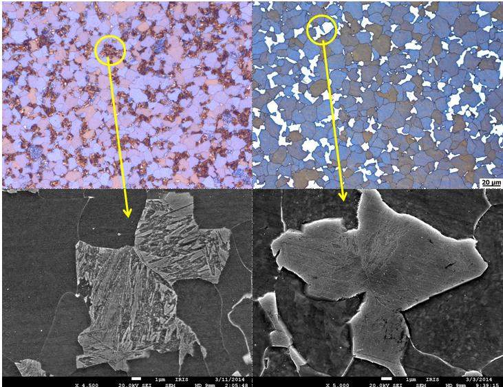 请教:下图分别是什么组织?说明:图中的两种组织的成分上只是Mn含量不同,第1列Mn约0.6%,第2列Mn约1.1%;第一行是采用Lepera溶液腐蚀得到的彩色金相,棕黄色、蓝色、棕色的为基体铁素体,第二相组织如图中黄色圆圈所示,第二行是其对应的扫描电镜图。请大家帮忙分析这两种第二相分别是什么组织,二者的维氏硬度都在400甚至更高。 360截图20140314095441578.jpg |