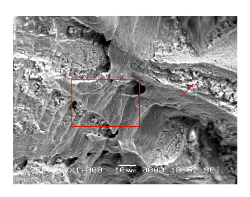 各位虫友好,图片显示为Cu合金的拉伸断口图,想问下图中箭头所指的那些颗粒状物质是什么情况?还有框框中那种花纹是属于哪种? 拜托各位不吝赐教啊!谢谢啦~