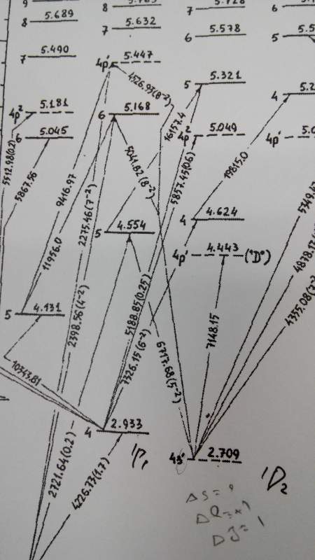 2.能级为2.709ev的谱项是1D2(1是2S+1,2是J),组态是3d4s. 它左边能级为2.933ev的谱项是1P1,组态是4s4p. 为什么这两个能级之间不能跃迁?并不与选择定则冲突啊?