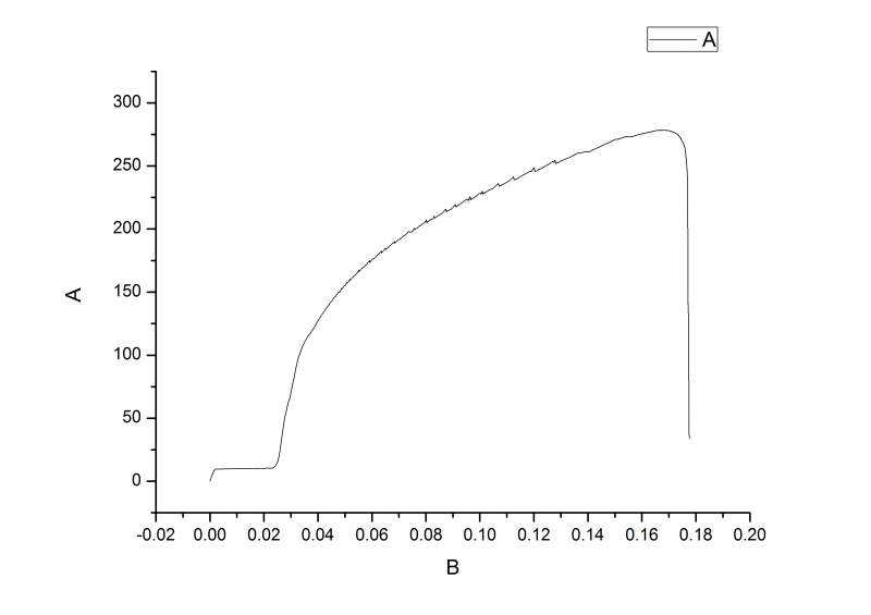 从图中看出,屈服应力(此处定义为塑性变形0.2%处对应的应力)为100左右,拉伸极限应力为275左右,最大延伸率为0.17即17%。