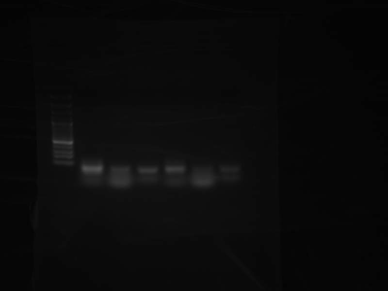 第一次做相关实验,六个道分别是三对primer在两个不同退火温度的结果