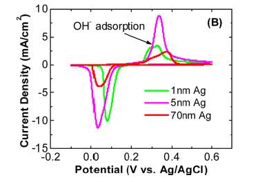 文献里有用纳米银负载的玻碳电极作为工作电极在氢氧化钾溶液中,来测试氢氧根的吸附和脱附曲线,他的扫描范围是-0.1-0.6V,参比电极是Ag/AgCl,我用同样的方法,使用的是氧化钛负载,并将扫描范围拓宽至-0.5-1.0V都没有看到有任何吸附脱附峰,想请教大家为什么会出现此类现象?