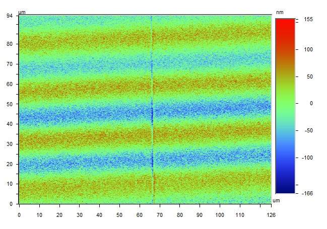 我用白光干涉仪测量玻璃时,条纹不太稳定,测得的数据明显不太对啊,如下图所示,中间的一道划痕是我的数据,但是整幅图上有波纹状的东西,怎么回事啊,求高人指点,急急急!