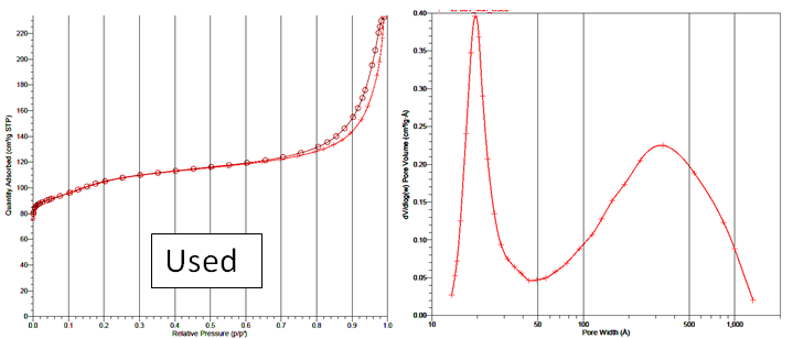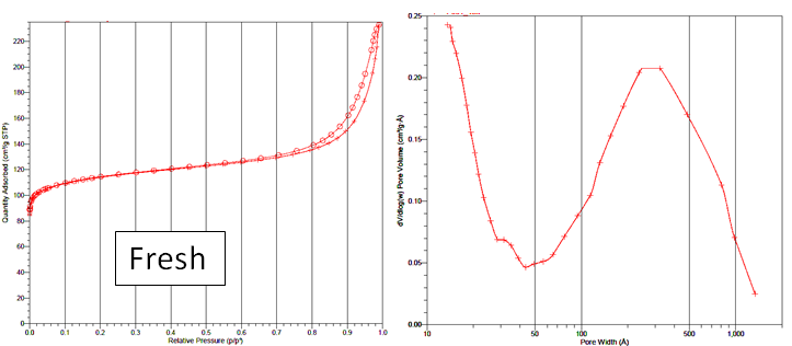 下图是fresh和反应24小时之后催化剂的孔径分布图,不解的是,为什么催化剂用过之后反而还多了2nm左右的孔,实在不解。望高手指教! Fresh 催化剂的BET 面积为433 m2/g, 微孔面积为299 m2/g, 总孔容为0.30 cm3/g Used 催化剂的BET面积为369 m2/g, 微孔面积为182 m2/g, 总孔容为0.29 cm3/g Fresh.png Used.png |