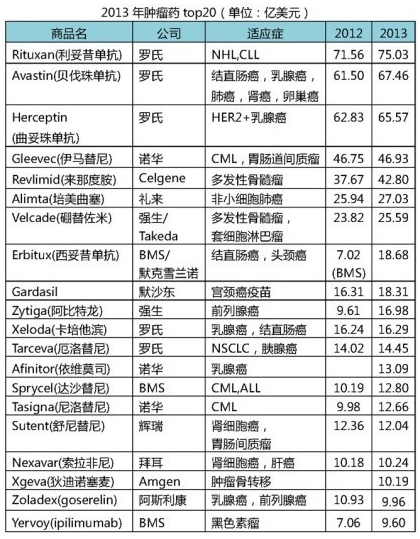 2013最畅销抗肿瘤药名单 罗氏遥遥领先!(转自BIOONNEWS)