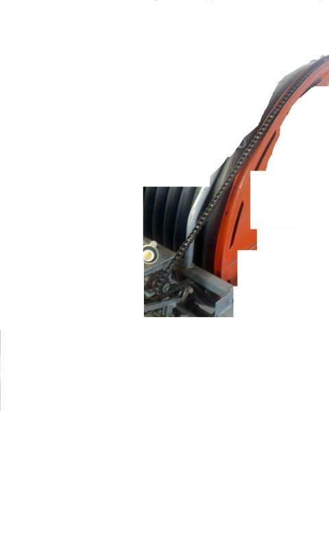 求教大神,链传动的传动比如何计算,一端由链轮支撑,另一端没有链轮,链条就搭在这个橘黄色转盘的缝隙里,主要靠几个钉子把链条固定住,链传动带动整个转盘转动,请教大神这样的链传动的传动比该如何计算呀? IMAG1015.jpg |