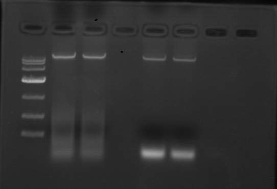 lz近日做pcr,要扩一条800bpr条带,但是扩了好多次没有扩出来目的条带,但是很奇怪总是在最上边有一条10000多bp的条带,延伸时间才50s呀,怎么会出来这条带呢,现在确认pcr体系,模板都是没有问题的。做了梯度pcr也是一样的结果。试着回收测个序,结果回收两次都回收 不到。附件里用的marker 是10000的。。同行们,帮帮忙,快纠结死了。