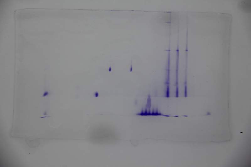 我做了好几次的血清和marker蛋白,凝胶都用的12%的胶,血清图的横纵条纹很多,而且感觉点有点少。marker图右边三道拖尾很严重,其他的点都没有这个现象,这是怎么回事啊?