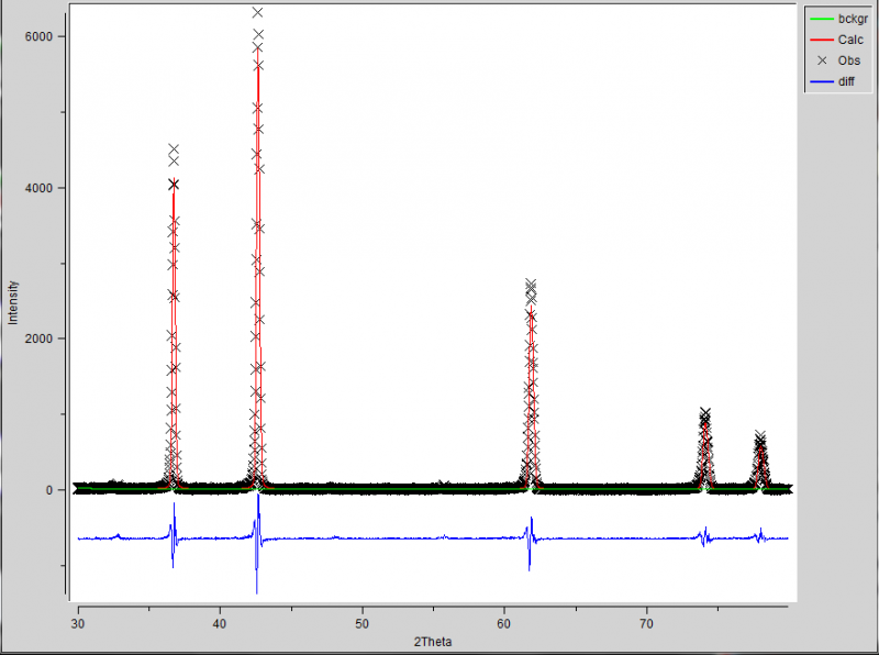 GSAS精修后只能到这样,然后就下不去了,Rp大概是0.25,wRp大概是0.12,个人看图的感觉是某一两个参数没修正好,因为峰位置上计算值和对应的实验值的偏差(蓝色线)比较统一,也不知道这样的理解对不对,求高手指导怎样才能使拟合结果更好?需要怎么修参数?谢谢!!! GSAS.PNG |