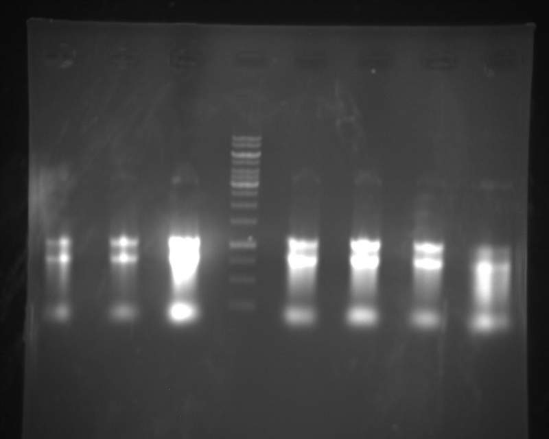 第四个是Marker 本来pET32a是5900bp 质粒跑带应该是6000bp或3000bp附近 最下面一条是没除干净的RNA 在跑完的带的3000bp处有少量的质粒超螺旋带 还算可以 但所有样品都有两条异常明亮的带 求大神指教为什么跑成这样 12sg you.jpg |